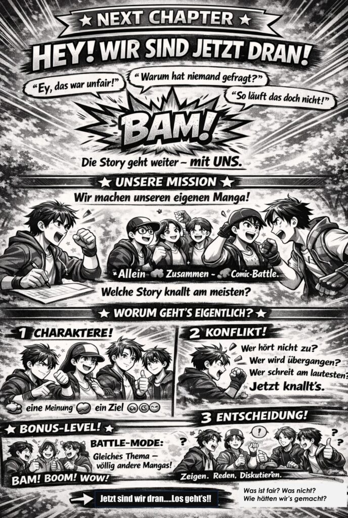 Die Geschichte fängt hier an – bei Euch. Konflikte, Fairness und Zusammenhalt kennt Ihr. Jetzt seid Ihr dran: Macht Eure eigenen Comics! Erfindet Figuren, zeigt echte Situationen und gestaltet, wie Ihr entscheiden würdet. Allein oder zusammen – kreativ und ehrlich. Denn Eure Sicht und Eure Entscheidung zählt.